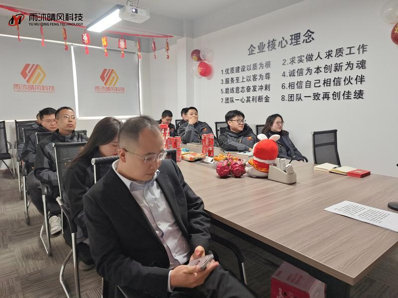新春將至,雨沐晴風科技 2025 年終總結會順利召開。全體員工齊聚一堂,回顧年度發展成果、復盤經營工作,明確 2026 年發展方向,為新一年發展凝心聚力。 會上,首先開展年度經營數據復盤工作,財務部劉總對公司全年營收、成本、利潤等關鍵經營指標作詳細匯報,以數據為公司戰略規劃提供堅實支撐。 各部門依次作年度工作總結,副總李祝軍、項目經理唐維及項目部、業務部、行政部等各部門同事,分別分享了 2025 年工作成果、經驗心得,并明確了 2026 年工作規劃,各部門的深耕細作與通力協作,盡顯公司團隊的凝聚力與戰斗力。 李總在會上發表年度總結講話,解讀公司 2025 年整體經營情況,深入分析市場機遇與挑戰,為公司 2026 年發展擘畫清晰藍圖,為全體員工注入奮進動力。會議還設置了新春紅包派送環節,李總為大家送上新年祝福,現場洋溢著溫馨的節日氛圍。 此次年終總結會,既是對 2025 年工作的全面復盤,更是對 2026 年工作的動員部署。新的一年,雨沐晴風科技全體員工將以此次會議為起點,凝心聚力、開拓創新,以全新姿態迎接新挑戰、搶抓新機遇,攜手書寫公司發展新篇章。值此新春佳節來臨之際,公司也提前祝愿全體員工新春快樂、闔家幸福、萬事順意!